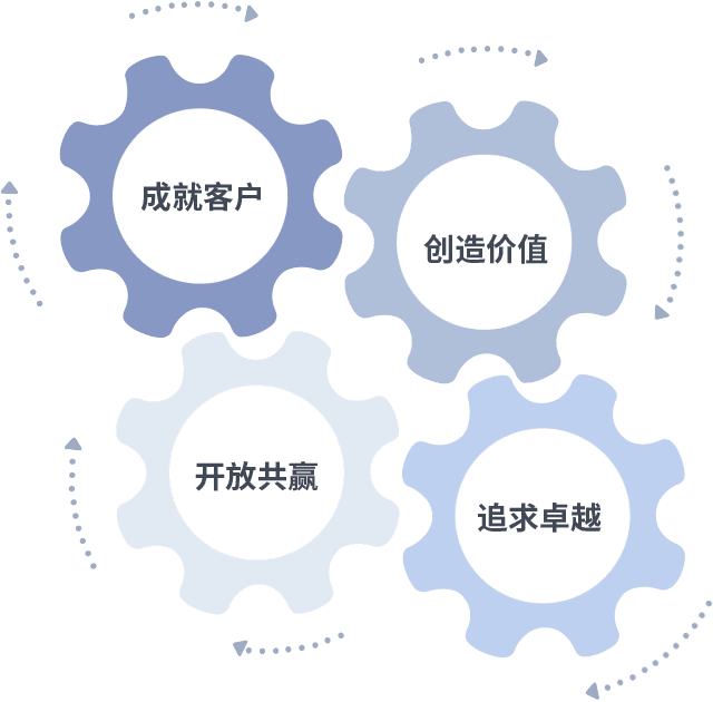 成就客户是一切决策的出发点,,创造价值是衡量所有工作的标准,,追求卓越是我们做事做人的态度,,,,开放共赢是我们的格局也是最终的结果。。。。价值观的齿轮环环相扣,,,推动着组织里的每个人不断向前。。。